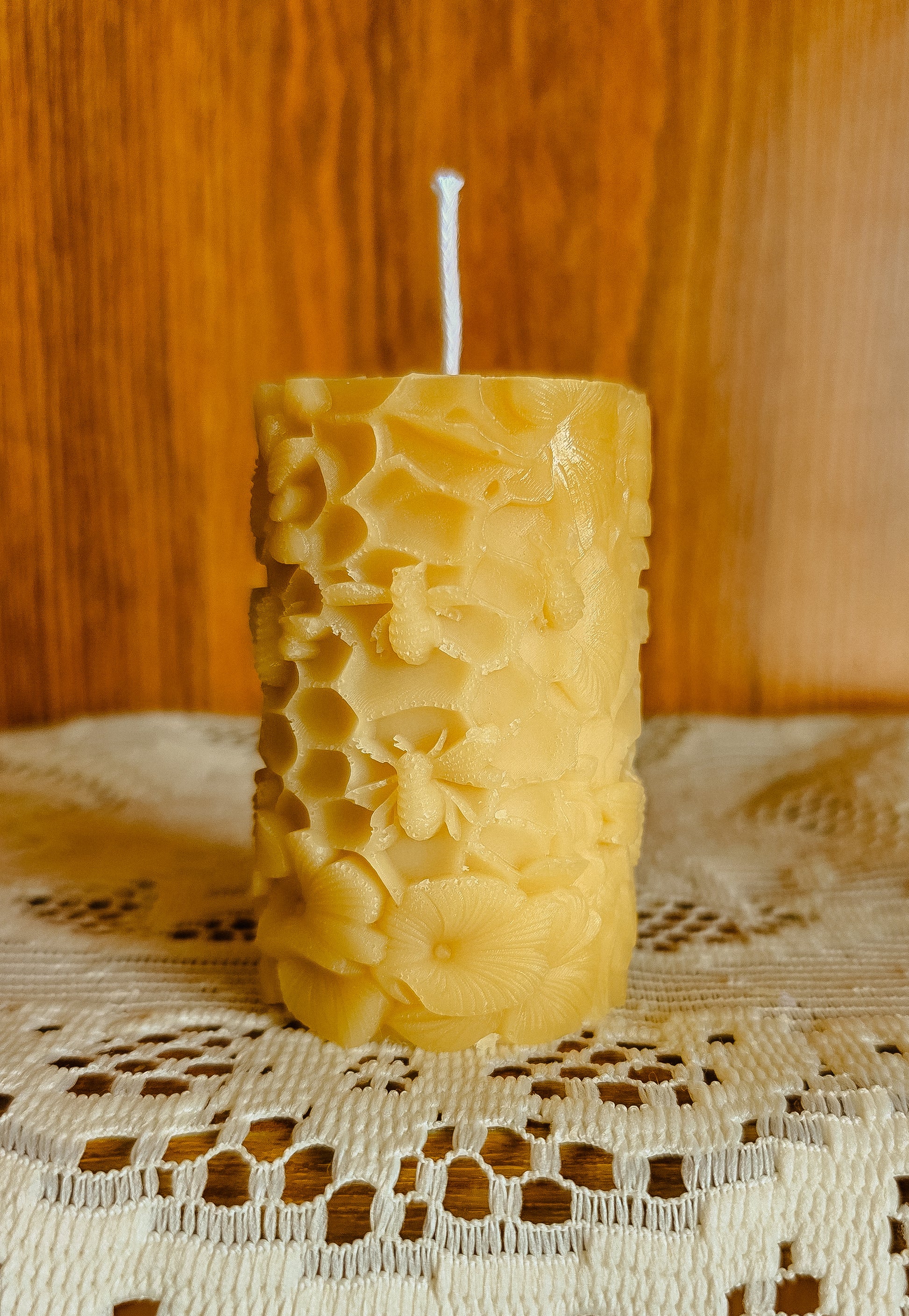 This delicate mini pillar is detailed with bees and flowers. Stands12 cm tall and 4 cm wide.