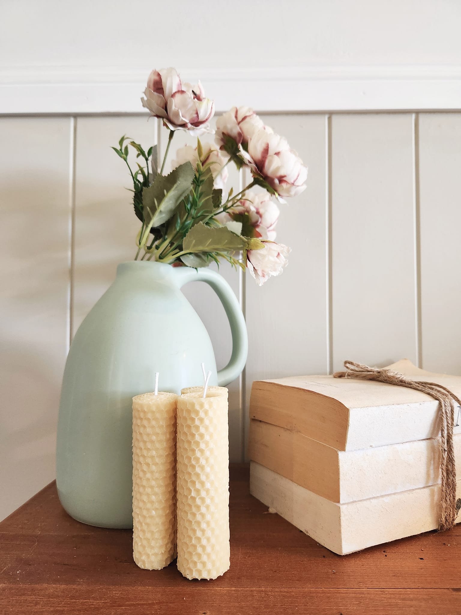 This small rolled candle stands 10 cm tall, 3 cm wide and burns for 5 hours. Fits most standard tealight width candle holders. Available individually for $6 or three for $15.
