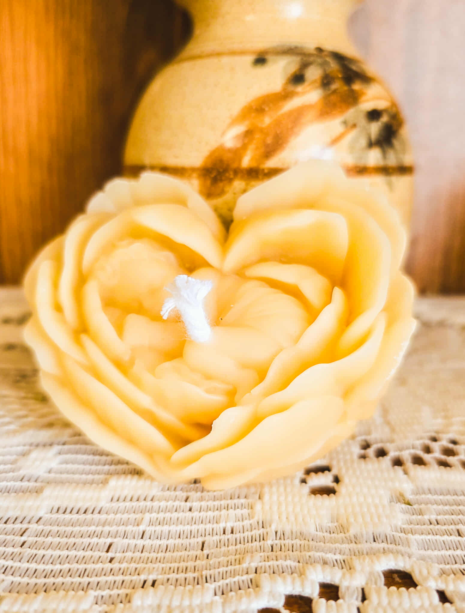 This delicate candle shows a baby sleeping peacefully inside a flower heart.